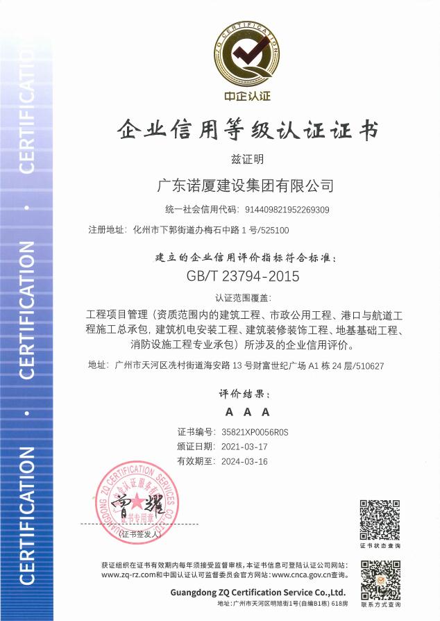 廣東諾廈建設集團有限公司是諾廈集團的核心企業,具備國家房屋建筑工程施工總承包壹級、市政工程施工總承包壹級、港口與航道工程總承包、建筑裝修裝飾工程、消防設施工程、地基基礎工程、機電設備安裝工程、體育場地設施工程、建筑智能化工程、河湖整治工程、水利水電工程等資質。......